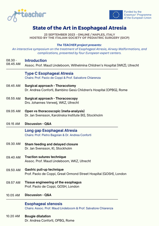 The TEACHER: State of the art in Esophageal Atresia, Naples, Italy 23/09/2023 - 23/09/2023, has been accredited by the European Accreditation Council for Continuing Medical Education (EACCME®) with 3.5 European CME credits (ECMEC®s). Each medical specialist should claim only those hours of credit that he/she actually spent in the educational activity.