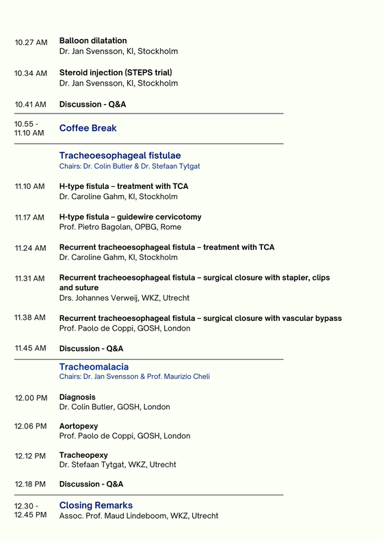 - Tracheoesophageal Fistulae (Chair: Dr. Colin Butler & Dr. Stefaan Tytgat)